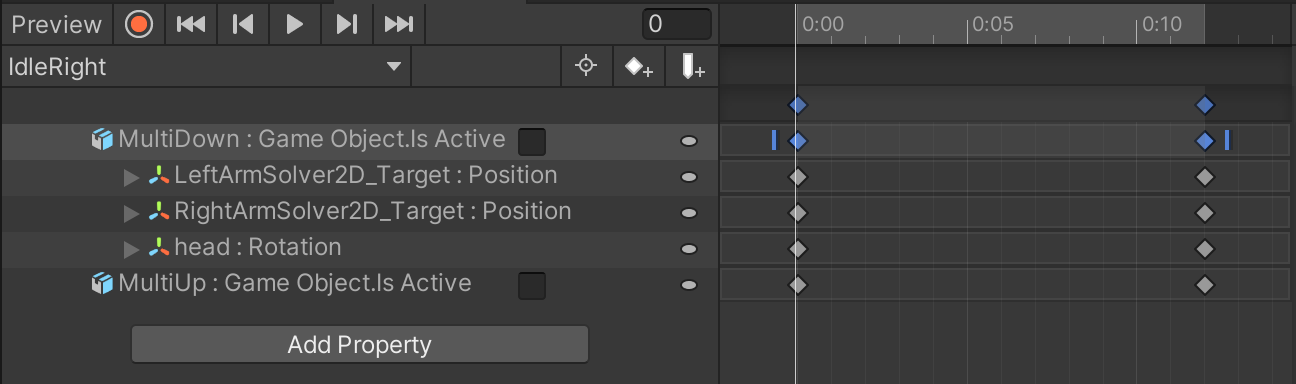 But first, a little more setup is required. Right now, your character probably looks pretty crazy in the Scene, facing all directions at once. When we animate the character, we only want to see one of its directions at a time. That means we will want to hide the directions we are not animating. To do that, in the Animation pane, select Add Property, then find the sprites under the parent sprites that you want to hide, and select the Is Active property.