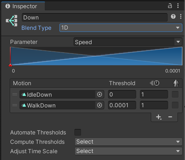 - For example, for the Down direction, in the first motion field select the IdleDown animation and set its Threshold to 0, then for the second motion field, select the WalkDown animation and set its **Threshold to 0.0001.