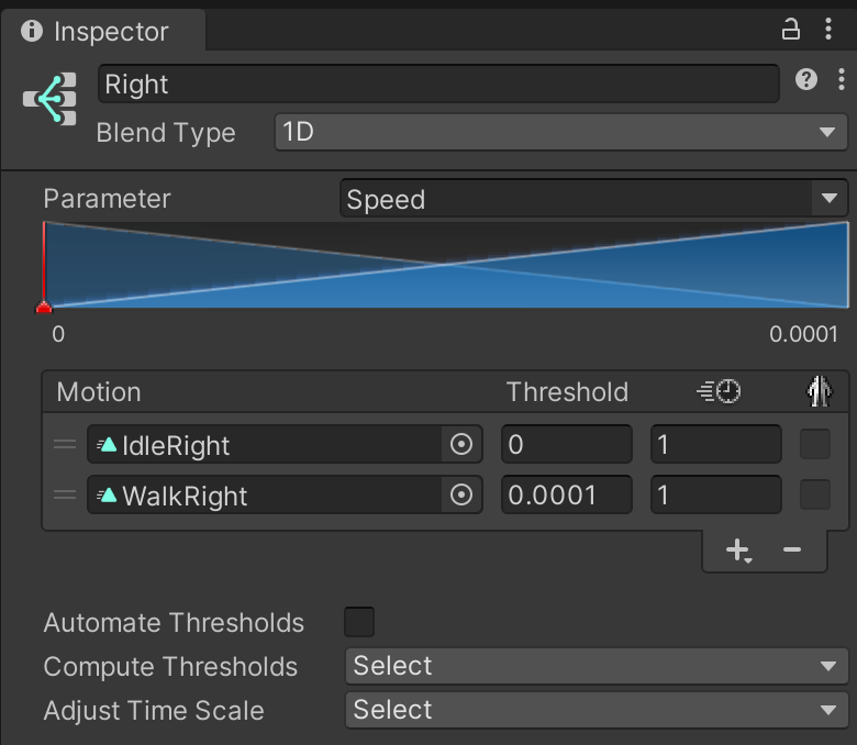 - In each of your directional sub-Blend Trees, go to the Inspector and set the Blend Type to 1D, and set the Parameter to Speed. Add two motion fields by selecting + > Add Motion Field. For each direction, select an idle animation and a walk animation.