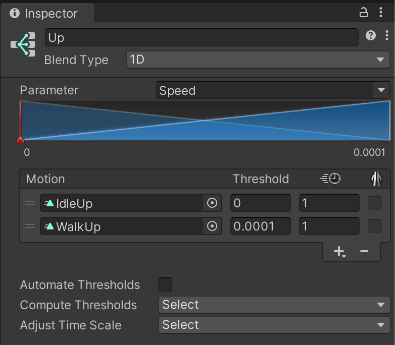 For the Up direction, in the first motion field select the IdleUp animation and set its Threshold to 0, then for the second motion field, select the WalkUp animation and set its Threshold to 0.0001.