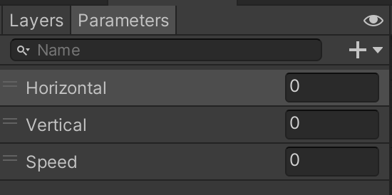 Add three new float parameters by selecting + > Float. Name the parameters Horizontal, Vertical and Speed. These parameters can be controlled by your character’s movement script, and we will use them here to set conditional animations based on player input.