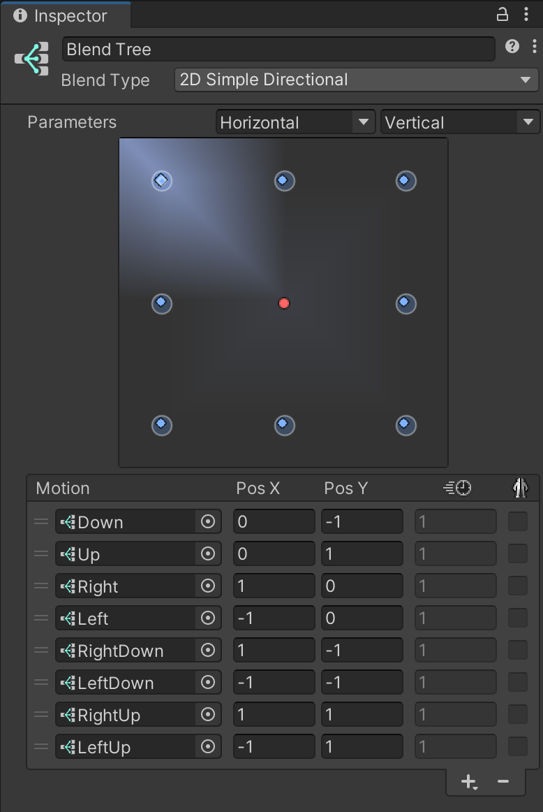 Select the Blend Tree node, and in the Inspector, change the Blend Type to 2D Simple Directional. Set the Parameters below the drop-down to Horizontal and Vertical.